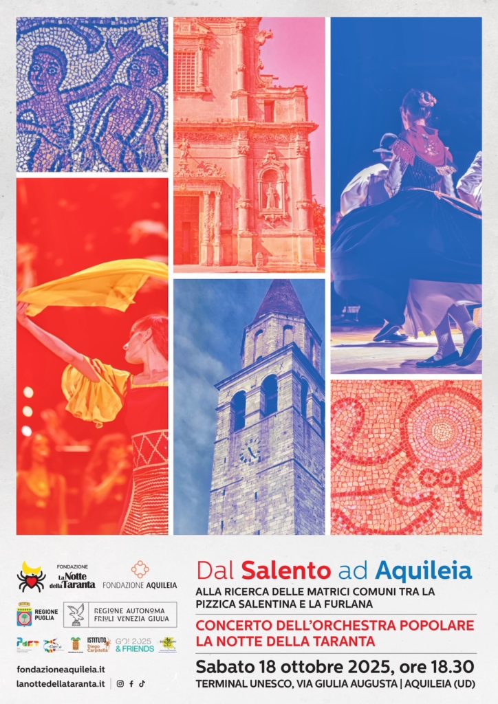Il primo appuntamento sarà sabato 18 ottobre ore 18:30 al Terminal Unesco di Aquileia, con un concerto promosso dalla Fondazione La Notte della Taranta, che inaugura ufficialmente il percorso di ricerca e dialogo tra le nostre tradizioni musicali.