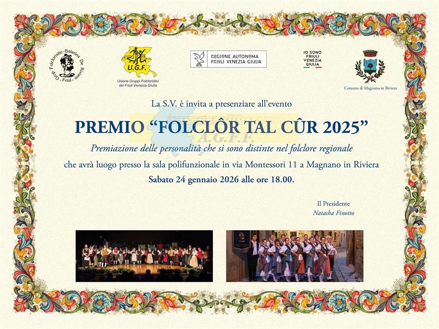 Iniziativa ideata nel 2003 dall’Associazione tra i Gruppi Folcloristici della Regione Friuli Venezia Giulia (AGFF). Questo premio, a cadenza biennale, ha lo scopo di dare un riconoscimento alle persone che operano nel campo del folclore e che si sono distinte nella ricerca, salvaguardia e divulgazione del grande patrimonio folcloristico della nostra Regione.