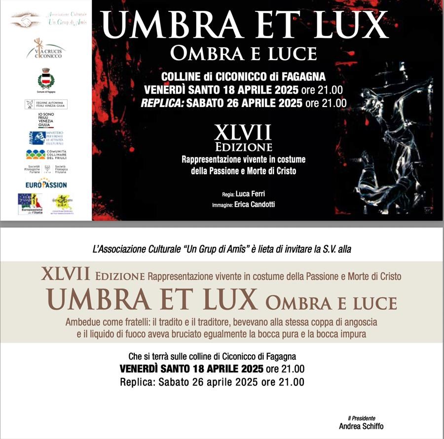 L'associazione culturale Un Grup di Amis organizza la Sacra Rappresentazione della Passione di Cristo a Ciconicco di Fagagna (Udine), un evento che unisce la comunità locale e coinvolge centinaia di figuranti e volontari. Le rappresentazioni si svolgono solitamente in occasione del Venerdì Santo, sulle colline del paese, e sono caratterizzate da una forte spiritualità e identità comunitaria.